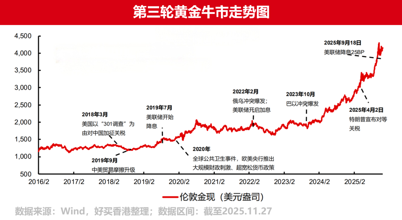 貨幣政策轉(zhuǎn)向:作為“無息資產(chǎn)”,黃金價格與實際利率呈顯著負相關(guān)。自今年9月開始,美聯(lián)儲已完成三次降息,為全球流動性松綁,成為推高金價最直接的“催化劑”。